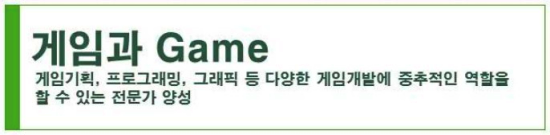 ์ปดํจํฐ๊ฒ์์ ๊ณต, ์ฌ์ด๋ฒ๊ฒ์๊ฒฝ์, ๊ฒ์, ๊ฒ์๊ธฐํ๋น์ฆ๋์ค, ๊ฒ์์ปจ์คํ , ๊ฒ์์ฝํ ์ธ , ์ธํฐ๋ท๊ฒ์, ์ปดํจํฐ๊ฒ์๊ณผ, ๊ฒ์ํ๋ก๋์, ๋ชจ๋ฐ์ผ ๊ฒ์, ์์&๊ฒ์์ฝํ ์ธ , ๋ฉํฐ๋ฏธ๋์ด๊ฒ์, ๋น์ฃผ์ผ๊ฒ์์ปจํ ์ธ , ์ปดํจํฐ๊ฒ์์ ๋ณด, ๊ฒ์๋ฏธ๋์ด, ์์ฉ์ํํธ์จ์ด ๋ฑ์ ํ๊ณผ ๋ฐ ๊ณ์ด ์ ๊ณต