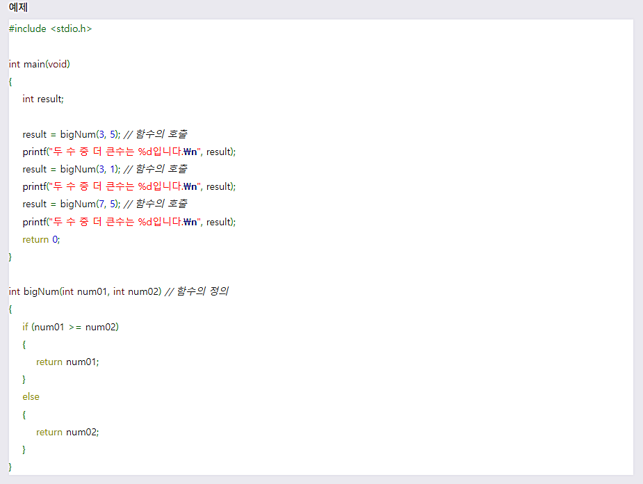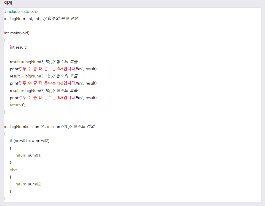CμΈμ΄μμλ κ°μ₯ λ¨Όμ main() ν¨μκ° μ»΄νμΌλ¬μ μν΄ μ»΄νμΌλ©λλ€. μμ μμ μμ μ»΄νμΌλ¬λ main() ν¨μμ λ±μ₯νλ bigNum() ν¨μλ₯Ό μμ§ μμ§ λͺ»νκΈ° λλ¬Έμ μ»΄νμΌ μ€λ₯λ₯Ό λ°μμν΅λλ€. λ°λΌμ μ»΄νμΌλ¬μ bigNum() ν¨μλ λμ€μ μ μλμ΄ μλ€κ³ μλ €μ€μΌν©λλ€. κ·Έ μν μ νλ κ²μ΄ λ°λ‘ ν¨μμ μν(prototype) μ μΈμ λλ€.