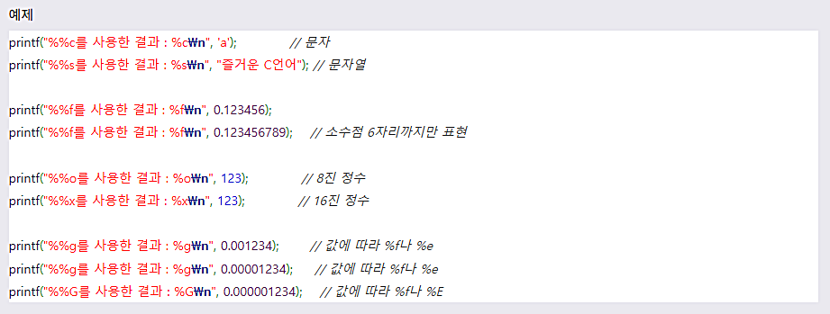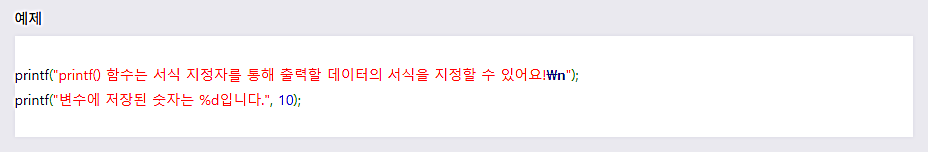 μμ μμ μμ λ λ²μ§Έ printf() ν¨μμ λμ¨ '%d'μ κ°μ λ¬Έμλ₯Ό μμμ§μ μλΌκ³ ν©λλ€. printf() ν¨μμμλ μ΄λ¬ν μμ μ§μ μλ₯Ό ν΅ν΄ μΆλ ₯ν λ°μ΄ν°μ μμμ μ¬μ©μκ° μ§μ μ§μ ν μ μμ΅λλ€.