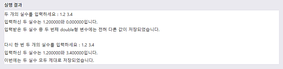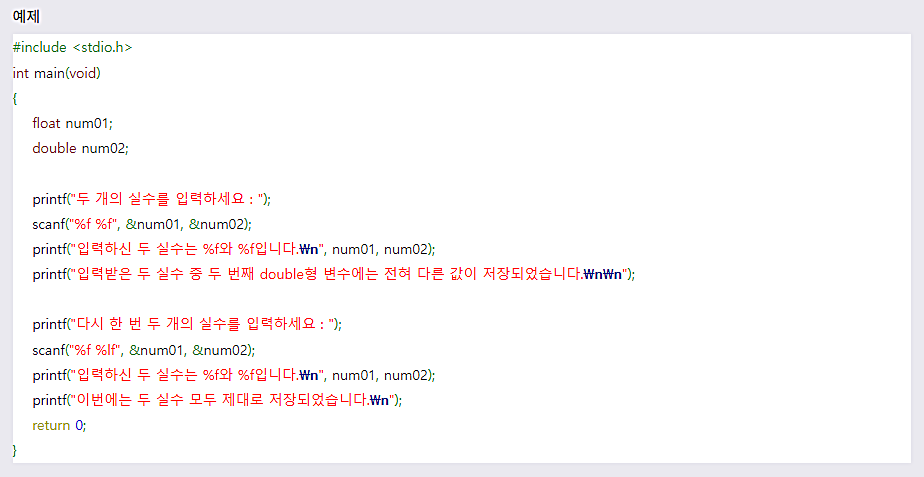 scanf() ν¨μλ‘ floatν μ€μλ₯Ό μ λ ₯λ°μ λλ μμ μ§μ μλ‘ '%f'λ₯Ό μ¬μ©νλ©΄ λ©λλ€. νμ§λ§ doubleν μ€μλ₯Ό μ λ ₯λ°μ λλ printf() ν¨μμμμ²λΌ '%f'λ₯Ό μ¬μ©νλ©΄ μλ©λλ€.