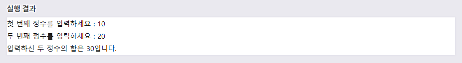 λ€μ μμ λ μ¬μ©μλ‘λΆν° μ μλ₯Ό λ λ² μ λ ₯λ°μμ κ·Έ ν©μ μΆλ ₯νλ μμ μ λλ€.