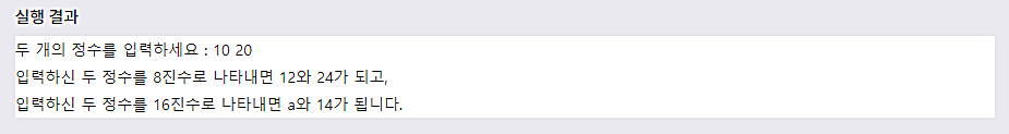 λ€μ μμ λ μ¬μ©μλ‘λΆν° λ κ°μ μ μλ₯Ό ν λ²μ μ λ ₯λ°μ κ°κ° 8μ§μμ 16μ§μλ‘ μΆλ ₯νλ μμ μ λλ€.