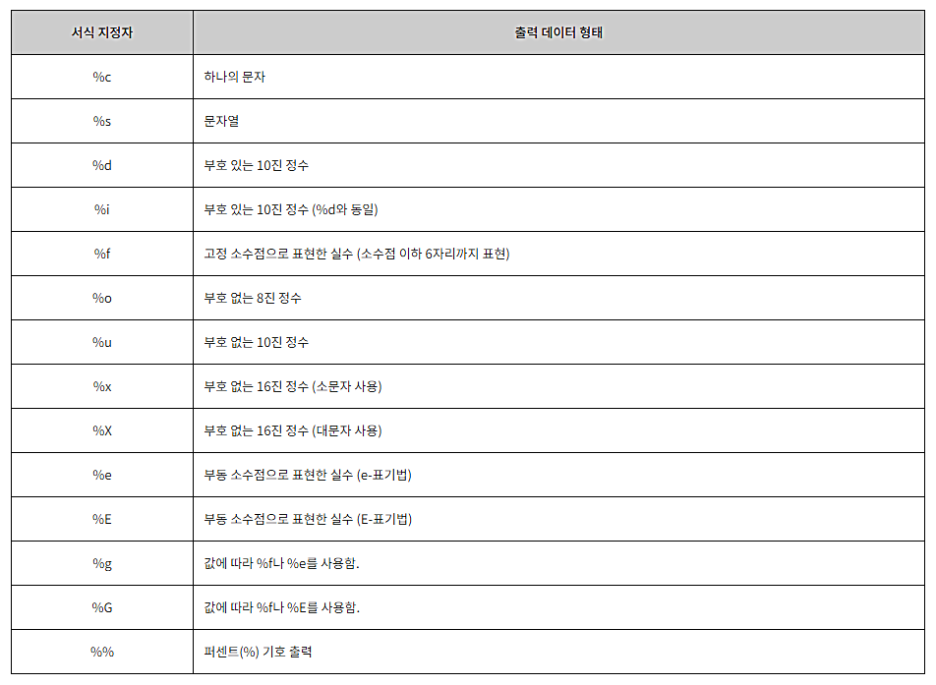 printf() ν¨μμ fλ formattedμ μ½μμ΄λ©°, μμνλ μΆλ ₯μ μ§μνλ€λ μλ―Έμ λλ€. μ΄ ν¨μλ μΆλ ₯ν λ°μ΄ν°λ₯Ό μ΄λ€ μμμ λ§μΆ° μΆλ ₯ν μ§ μμ μ§μ μ(format specifier)λ₯Ό ν΅ν΄ μ§μ μ§μ ν μ μμ΅λλ€.