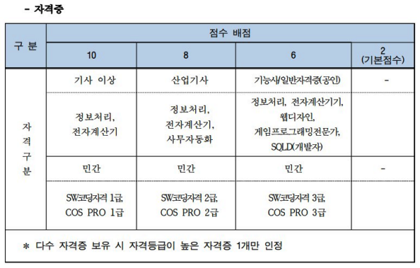 ♣ ๊ธฐ์ฌ(์ ๋ณด์ฒ๋ฆฌ, ์ ์๊ณ์ฐ๊ธฐ), ์ฐ์ ๊ธฐ์ฌ(์ ๋ณด์ฒ๋ฆฌ, ์ ์๊ณ์ฐ๊ธฐ, ์ฌ๋ฌด์๋ํ), ๊ธฐ๋ฅ์ฌ(์ ๋ณด์ฒ๋ฆฌ, ์ ์๊ณ์ฐ๊ธฐ, ์น๋์์ธ), ๊ฒ์ ํ๋ก๊ทธ๋๋ฐ ์ ๋ฌธ๊ฐ, SQLD(๊ฐ๋ฐ์), SW ์ฝ๋ฉ ์๊ฒฉ(1~3๊ธ), COS PRO(1~3๊ธ)๋ฅผ ์ทจ๋ํ ์ฌ๋